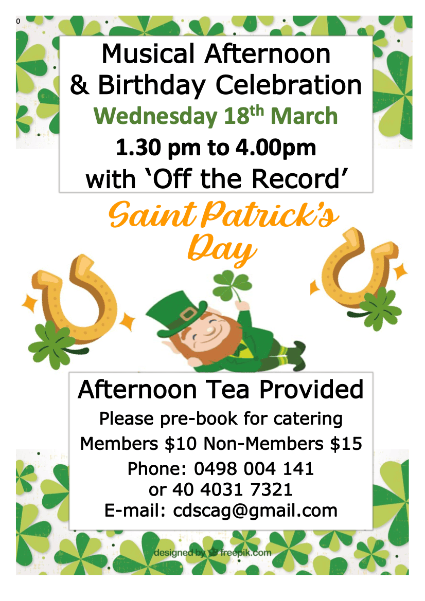 Come and spend the 3rd Wednesday of each month from 1:30pm to 4pm listening and singing along, and a chance to win a lucky door price. During these afternoons we also have our Birthday Celebrations! So bring your family and friends. Afternoon Tea is included. Members $10 & Non-members $12.